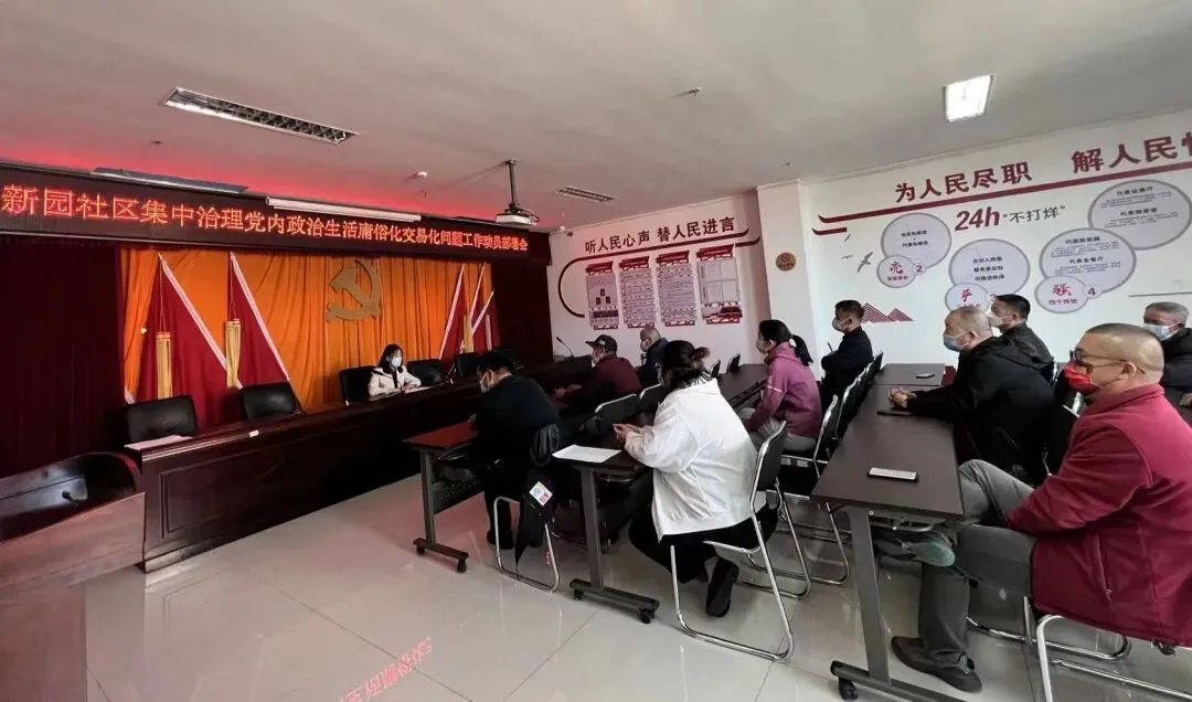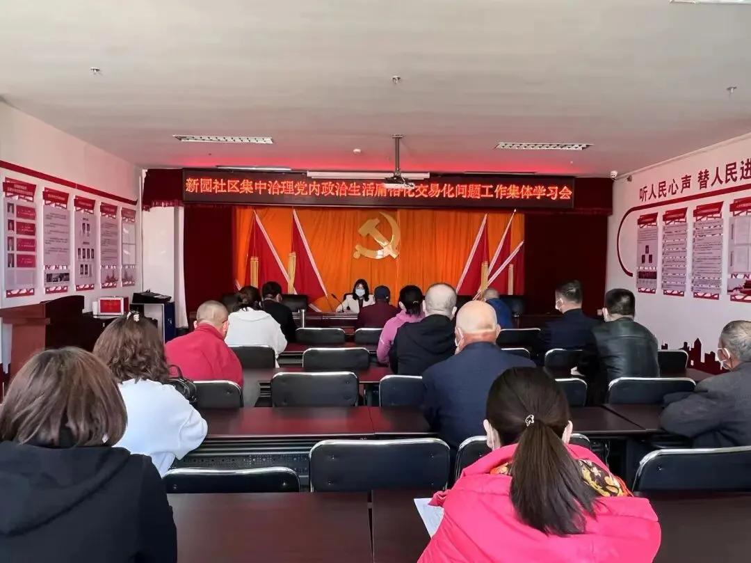 为深入贯彻落实上级党委有关要求,引导社区党员干部廉洁干事,保持党员队伍的先进性和纯洁性,新园社区党支部高度重视,将集中治理党内政治生活庸俗化交易化问题工作作为当前一项重要政治任务,坚持教育在先,强化思想引领,4月28日,组织召开集中治理党内政治生活庸俗化交易化问题动员部署会,会议由社区党支部书记徐艺萌同志主持,支部全体党员及社区“两委”成员参加会议。
