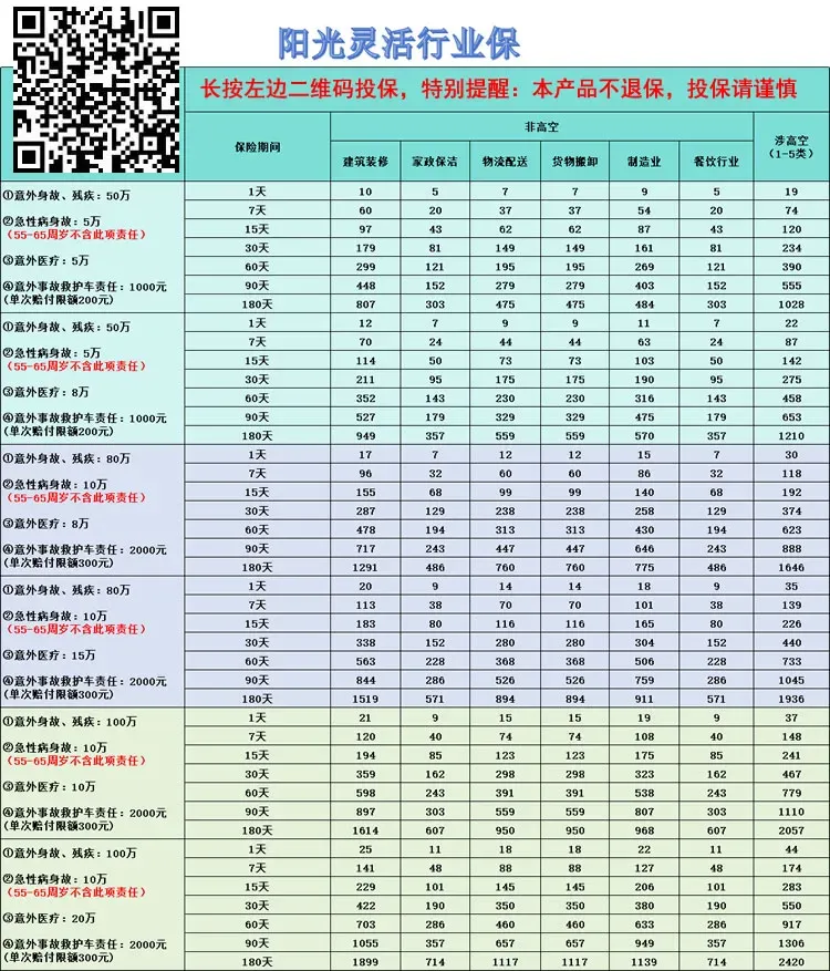 7、可选保高空,含猝死保障,可保餐饮业、家政保洁、建筑装修、物流配送、制造业,货物装卸。