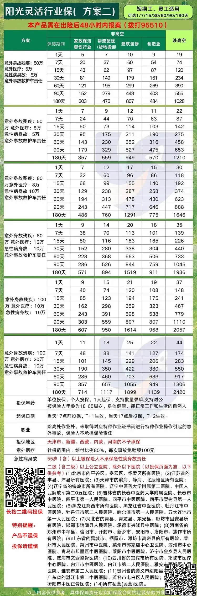 1、个人企业均可投保,18-65岁,1人起保,1-5类,可涉高,保期1/7/15/30天和60/90/180天,1-5类最高100万,意外医疗费用最高20万,急性病身故给付最高10万元。