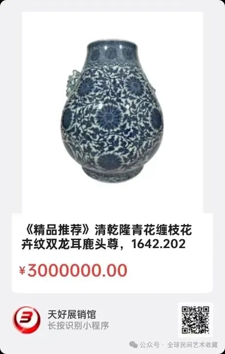 清乾隆青花缠枝花卉纹双龙耳鹿头尊,藏品尺寸:高42,宽36,口17,底足24。鹿头尊首见于康熙时期,因形似鹿头而得名。其造型恢弘俊伟,气派大方,甚宜殿堂陈设,故深得皇家喜爱,广为流行,是为清宫最尊贵的器形之一,见有粉彩、青花和仿汝、官、哥等品种。此鹿头尊形制高大,线条优美饱满,圆口以下渐广,腹部丰满鼓圆,肩部对饰夔龙形耳,釉面亮青平滑。通体纹饰以青花绘成,口沿和颈部绘回纹、团寿纹、如意纹三层纹饰,腹部主体纹饰为三重缠枝莲纹,取其“清廉”之寓意,留白得当,构图虽繁缛而不失疏朗。颈部及足部分绘莲瓣纹、卷草纹,底以青花书“大清乾隆年制”六字三行篆书款。由于其精湛的工艺、独特的设计以及深厚的文化价值,青花缠枝花卉纹双龙耳鹿头尊具有很高的收藏价值。对于瓷器收藏爱好者来说,这是一件乾隆时期少见之重器。上海博物馆、沈阳故宫博物院等国内大型文物机构皆珍藏有乾隆朝同类器。也曾在个大知名拍卖行卖出不菲的价格。耿宝昌先生所著《明清瓷器鉴定》中亦对此器形做过重点介绍,足显名贵。2024年 6月 26日,经天好评审团评审,以6票优势荣登精品榜,获第132期天好海选精品。来源1642.V.