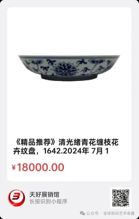 清光绪青花缠枝花卉纹盘,藏品尺寸:高3.5,盘口15.5,底足9。这件青花缠枝莲纹盘敞口,浅弧腹,圈足。盘通体白地青花装饰,盘心及内外壁均饰青花缠枝莲纹,外底青花书“大清光绪年制”双行六字楷书款。造型规整,胎质洁白,釉质莹润,青料发色艳丽,青花绘莲纹,寓意“清廉”。该盘工艺精湛,绘画精细,款识工整,是清代光绪官窑的典型器物。2024年 7月 10日,经天好评审团评审,以6票优势荣登精品榜,获第134期天好海选精品。来源1642.V.