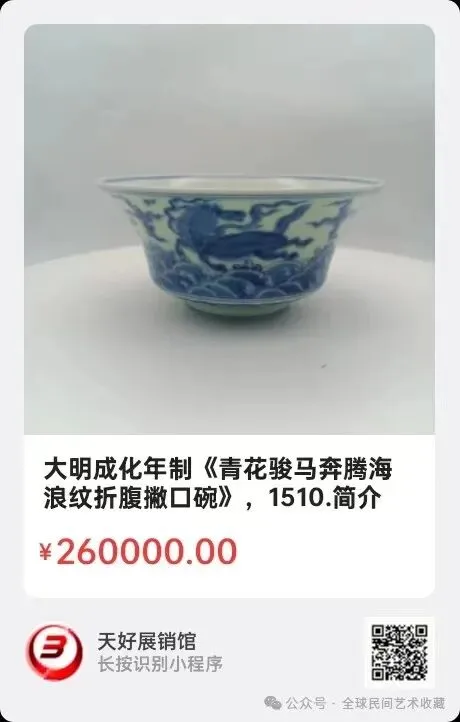 大明成化年制《青花骏马奔腾海浪纹折腹撇口碗》,高6.8㎝,口径14.7㎝,圈足径5.8㎝,重177.6克。简介:此成化年制青花骏马奔腾闹海撇口碗,瓷胎轻薄,坚硬,白色釉地泛青,青花发色浓艳,深沉,碗外绘画四匹飞马海浪中奔腾,内飞马闹海太阳光环围边,整体绘满彩,双线钩边阔,底兰色字款:大明成化年制。此青花碗设计精致典雅,工艺造型秀美,精巧绝伦。来源1510.V.