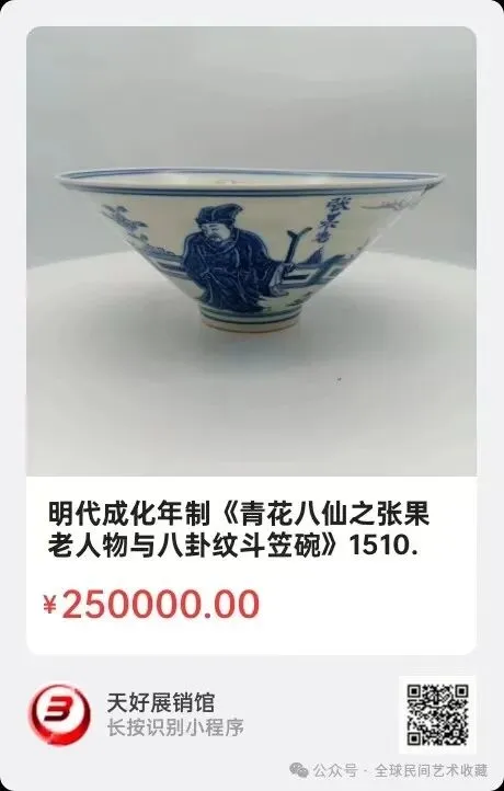 明代成化年制《青花八仙之张果老人物与八卦纹斗笠碗》,高6.6㎝,口径16.5㎝,底径4.2㎝。简介:上述《青花八仙之张果老及八卦纹斗笠碗》,胎体轻薄,均匀,洁白,胎色纯正细腻,致密,竖硬,腹底与圈足界线分明,碗内底宽平,釉色兰中泛灰,层次分明,呈色稳重,人物景致生动注名,绘画优美,整体给人印象清新典雅。来源1510.V.