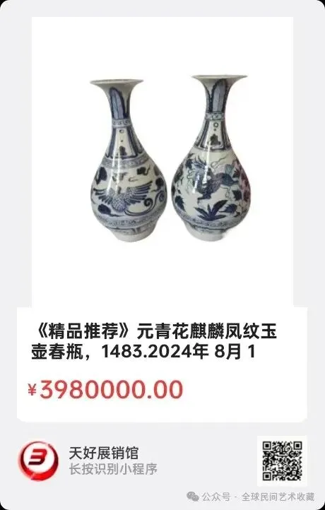 元青花麒麟凤纹玉壶春瓶,高:29公分,腹径:15公分,底:9公分,一对,阐述:优质的麻仓土,昂贵的苏麻沥青,美感的玉壶春,厰口卷草纹,颈部蕉叶纹,花卉纹,宝葫芦四面开窗,双圈绘卷草纹,腹部分别绘福鹿,奔驰在万花丛中,双凤飞翔在五彩祥瑞之中,绘卷草纹,宝葫芦开窗八面玲珑,福鹿双凤画功精堪,人见人爱,足梁外敞圈足内深外淺,温润如玉,晶莹剔透,胎呈肉红色,成双成对,不多见,是一对上了档次的收藏品。赞;万花丛中双鹿驰,凤鸟俩随祥瑞情,玉壶春瓶绘俊俏,工艺精堪谢古人。此瓶己经曹晓宇专家老师鉴定,瓷痴随笔於甲辰龙年秋。2024年 8月 14日,经天好评审团评审,以6票优势荣登精品榜,获第139期天好海选精品。来源1483。V.