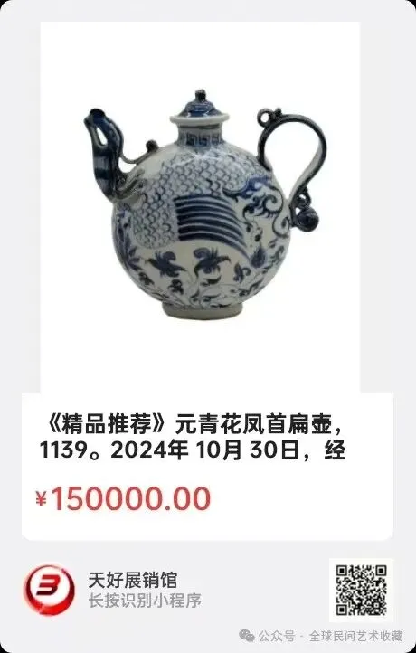 元青花凤首扁壶,有三层纹式,回纹,中间是凤纹,下面是缠枝莲纹。整个壶造型优雅。青花色沉稳,有下凹现象。好在有盖,体现了扁壶的完整性。尺寸高20口径5底径7.5。2024年 10月 30日,经天好评审团评审,以6票优势荣登精品榜,获第149期天好海选精品。来源1139。V.