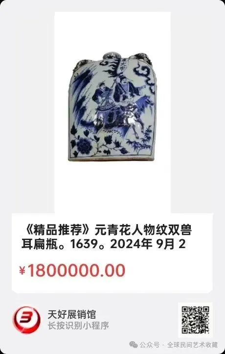 元青花人物纹双兽耳扁瓶。高34cm,宽26cm,厚9cm,口径6,5cm,足底直径23cm,2024年 9月 25日,经天好评审团评审,以6票优势荣登精品榜,获第145期天好海选精品。来源1639.V.