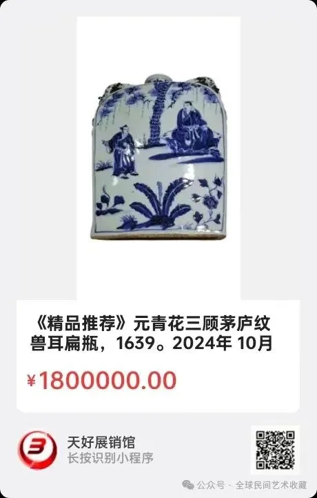元青花三顾茅庐纹兽耳扁瓶,高34cm,宽26cm,厚9cm,口径6,5cm,足底直径23cm。2024年 10月 2日,经天好评审团评审,以6票优势荣登精品榜,获第146期天好海选精品。来源1639。V.