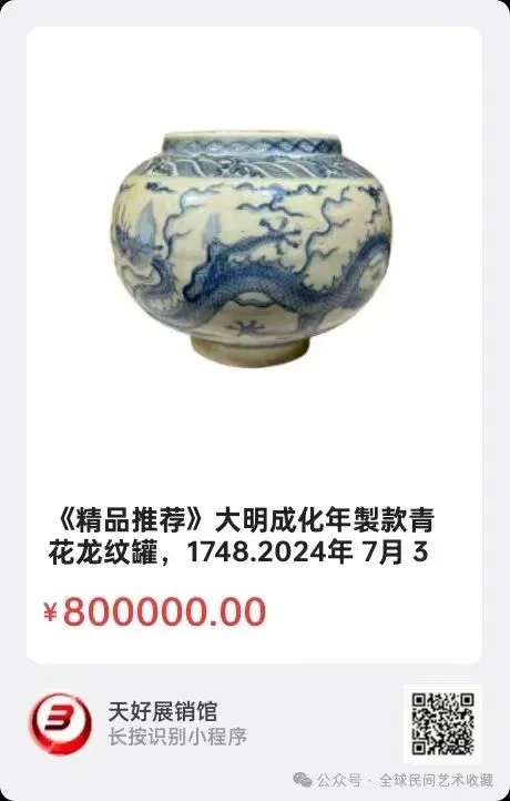 大明成化年製款青花龙纹罐,1、青花发散符合成化特征,2、成化胎体普遍轻薄,半透明度很高,迎光透视,可见胎体泛出淡淡的肉红色。此件瓷器有此特征。3、砂底有些呈褐黄色,俗称“米糊底”,这种类似火石红的“米糊底”,符合其时期特征,4、青花料上使用的是平等青(江西乐平县产的陂塘青),这种青花料颜色清淡典雅,蓝中闪灰,呈色非常稳定,在层次上这一时期的青花料也有了浓淡之分,浓者多用于勾勒纹饰线条,淡者则平涂上色,使图案开始出现浓淡深浅的层次变化(宣德遗风)。5、底款采用青料书写,(大字尖圆头非高,成字撇硬直到腰,化字人七平微头,制字衣横少越刀,明字窄平年应悟,成字一点头肩腰”)成化瓷器青花底款特征,6、此件罐造型庄重圆润。高度17cm,口径15cm,底足10cm。2024年 7月 31日,经天好评审团评审,以6票优势荣登精品榜,获第137期天好海选精品。来源1748。V.