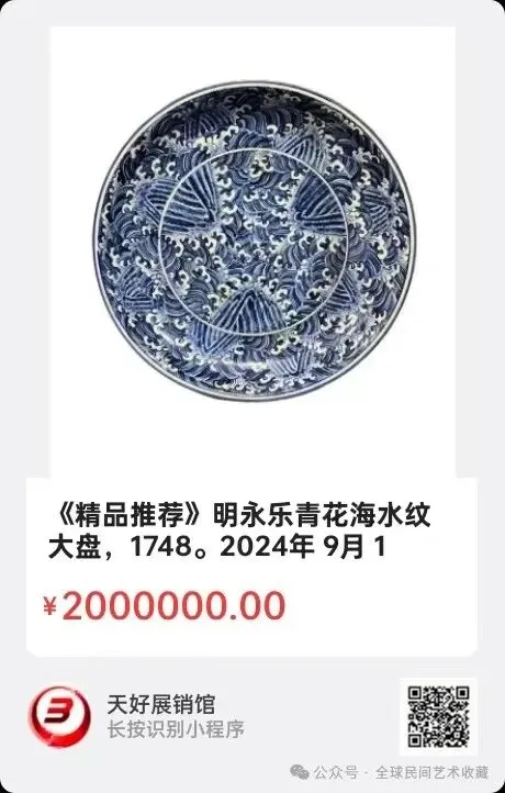明永乐青花海水纹大盘。该盘为圆唇,敞口微撇,深弧腹,圈足。通体以青花为饰,发色深沉,别具味道。海水以青花淡描绘制,海浪以留白体现,海象用青花勾线填色,以突出主题。其海水描绘更为形象逼真,整体画面生动传神,不落窠臼。外壁青花书“永乐年制”四字篆书款。口直经41cm,高6.5cm,底足直经30cm。2024年 9月 18日,经天好评审团评审,以6票优势荣登精品榜,获第144期天好海选精品。来源1748.V.