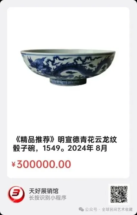 明宣德青花云龙纹骰子碗,口径28.2底径12高9.6cm,骰子碗是明宣德时期景德镇御窑厂专为宫廷烧制的玩掷骰子游戏或赌博用器,壁厚腹浅,装饰美丽,存世量少,极为珍贵。2024年 8月 7日,经天好评审团评审,以6票优势荣登精品榜,获第138期天好海选精品。来源1549.V.