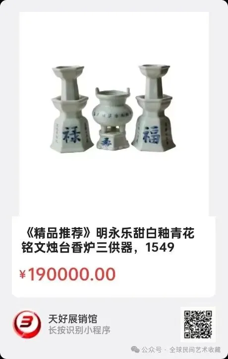 明永乐甜白釉青花铭文烛台香炉三供器,烛台高16.5底径9cm,香炉高11.5底径7.2cm。三供器有青花铭文和纪年,双层六方烛台楷书纪年“永乐九年岁次九月初九”;带六方底座立耳三足鼎式炉身楷书“永乐九年岁次九月初九浮梁洲王备”十五字,烛台与炉六方座各间书“福、绿、寿”三吉祥字。2024年 9月 4日,经天好评审团评审,以6票优势荣登精品榜,获第142期天好海选精品。来源1549.V.