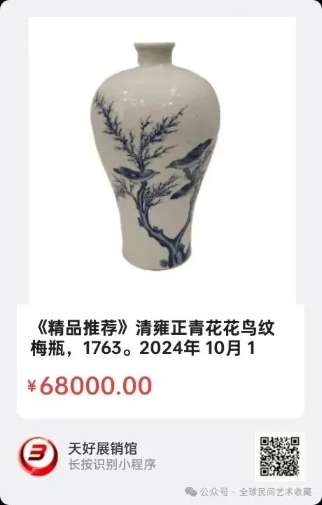 清雍正 青花花鸟梅瓶,藏品尺寸:高38厘米,宽22厘米。此梅瓶小口,短颈,丰肩,腹以下内敛,近底处外撇,玉璧形底。内施白釉。外壁青花装饰,通景绘鸟栖石榴图,栖落在石榴树上的山雀两两相对,野趣十足,别有情致。同时石榴因其独特的形状和颜色,被视为吉祥的象征。古语中有“千房同膜,千子如一”的说法,意味着石榴内部籽粒众多且均匀,常被用作表达子孙繁衍、家族兴旺的愿望。2025年 11月26日,经天好评审团评审,以8票优势荣登精品榜,获第192期天好海选精品。来源1642.V。