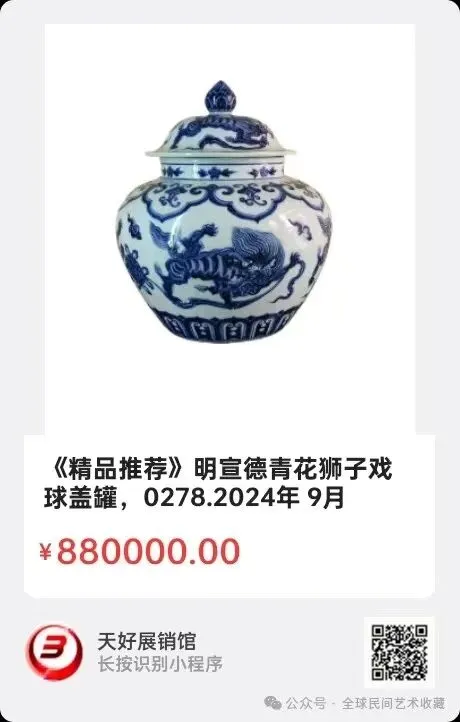 明宣德青花狮子戏球盖罐,尺寸40*38,明代宣德年制,大罐球形设计,釉色莹润。2024年 9月 4日,经天好评审团评审,以6票优势荣登精品榜,获第142期天好海选精品。来源0278.V.