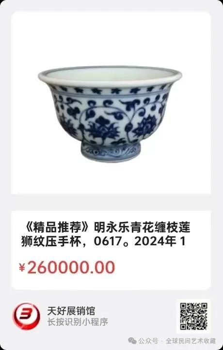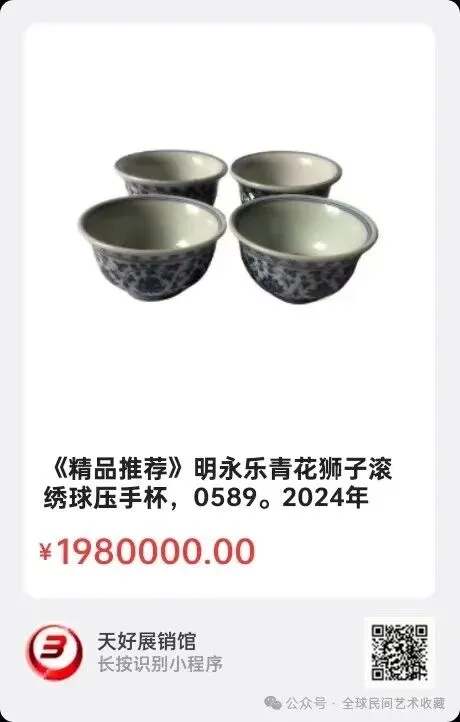 明永乐青花狮子滚绣球压手杯,高5.2 厘米,口径9.2 厘米,足径4.2 厘米,2024年 7月 17日,经天好评审团评审,以6票优势荣登精品榜,获第135期天好海选精品。来源0589.V.