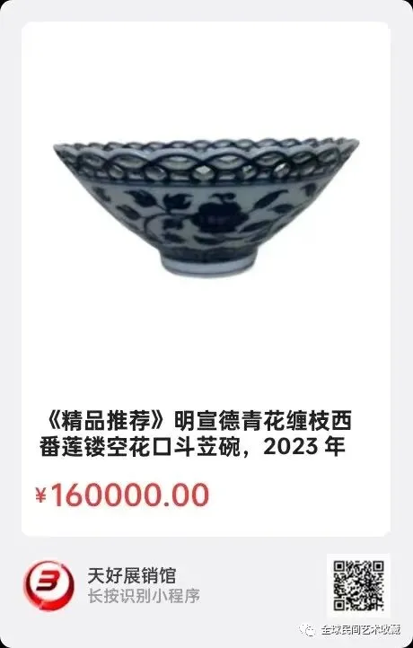 明宣德青花缠枝西番莲镂空花口斗苙碗,口宽16.5cm,底部5.5cm,高度8.8cm,此:宣德缠枝莲花口碗,造型优美,胎质结白,釉色翠蓝浓艳,碗内的各种青花球美观,碗口花形画工精细,花口碗保存完美。2023年7月12曰,经天好评审团评审,以7票优势荣登精品榜,获第八十九期天好海选精品。来源0617.V.
