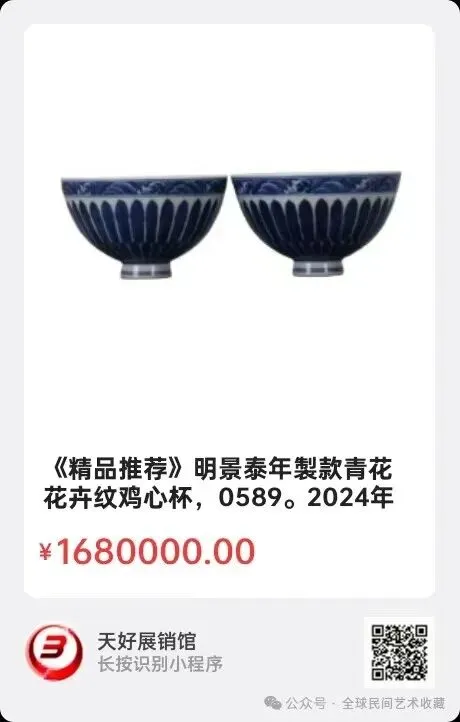 明景泰年製款青花花卉纹鸡心杯,高6 厘米,口径10 厘米,足径3 厘米,一对,2024年 8月 14日,经天好评审团评审,以6票优势荣登精品榜,获第139期天好海选精品。来源0589。V.