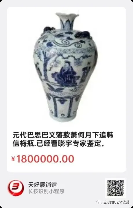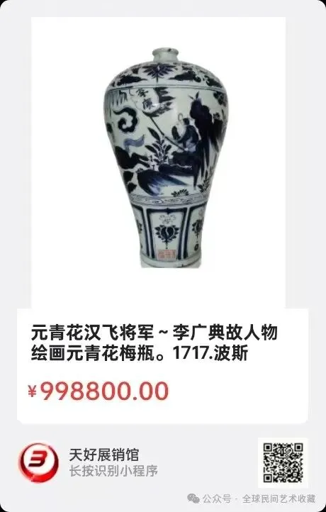 元青花汉飞将军~李广典故人物绘画元青花梅瓶。波斯文款,进口钴蓝宝石矿入釉,高龄土瓷胎,形体工艺完美,人物绘画威武霸气梅瓶,高约43厘米,口径5.5厘米,足径13.6厘米。来源1717.