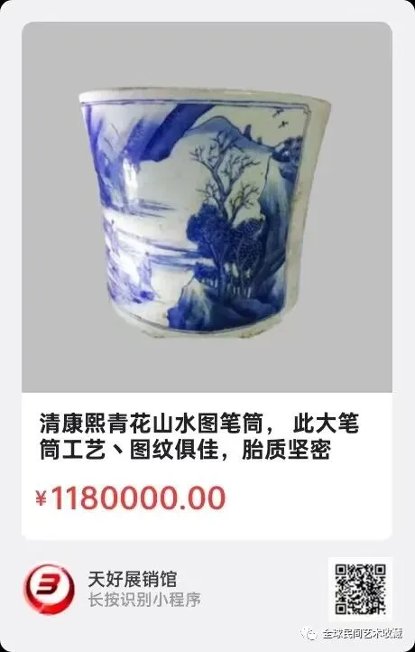 清康熙青花山水图笔筒,高17㎝,口径20㎝丶底径18㎝。此大笔筒工艺丶图纹俱佳,胎质坚密细腻,釉面光滑清爽,青花明快;造型大气,采用中国画的工笔画技法,山水人物疏密相间,花树山石水波精益求精,青花色调纯正鲜明,人物栩栩如生,乃清代早期青花笔筒的上乘之作。底部“大清康熙年制”六字符合清初字体特色。收藏者:尹本顺(尹笋君,74岁)是上世纪中国著名收藏家之一,入选多部中国收藏家大辞典,三次入选权威的《世界名人录》(北京的中国国家图书馆`香港特区图书馆丶英国大英图书馆丶美国国会图书馆等。来源:0169。
