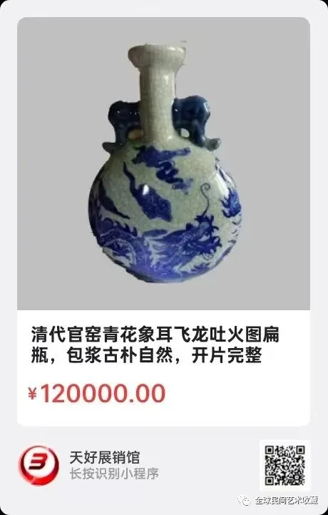 清代官窑青花象耳飞龙吐火图扁瓶,瓶高22㎝,中宽16㎝,口径4 . 5㎝。包浆古朴自然,开片完整清晰,制作精良,图饰精美壮观;瓶底阴刻篆书“官”字。收藏者:尹本顺(尹笋君,73岁),新中国唯一的双栖科学家兼双料作家兼深圳市首届十佳编辑记者(全市第二名)兼全国百佳新闻文化工作者兼上世纪中国著名收藏家。来源:0169。