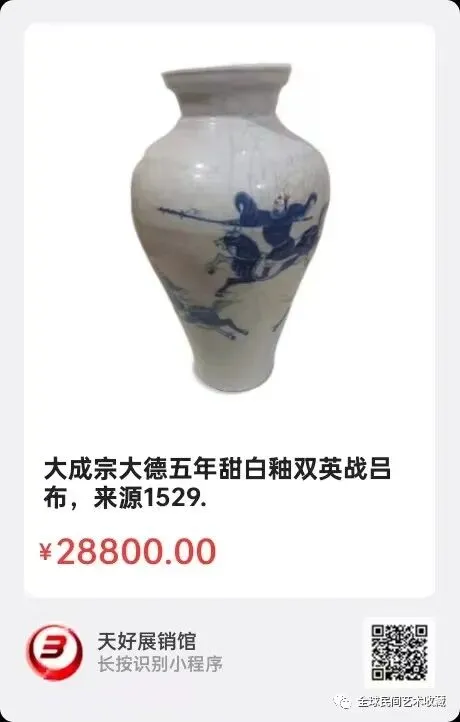 大成宗大德五年甜白釉双英战吕布,高45Cm宽24Cm口15Cm底部13Cm,来源1529.