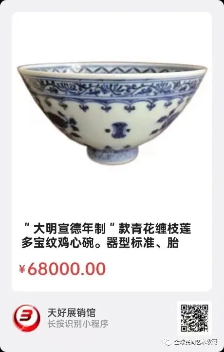 大明宣德青花缠枝莲多宝纹鸡心碗,"大明宣德年制"款青花缠枝莲多宝纹鸡心碗。器型标准、胎质细腻、发色漂亮、包浆自然到代,全品。宝物比图片漂亮。宝物自辩,认真出价。尺寸:高8.5cm,上口16cm,底足4.8cm。来源:0197。