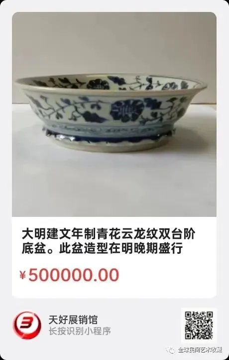 大明建文年制青花云龙纹双台阶底盆。此盆造型在明晚期盛行,故应为明万历、崇祯朝造,款识为"寄托款″。高6.4公分,口径20.2公分,底径13公分。来源:1169。