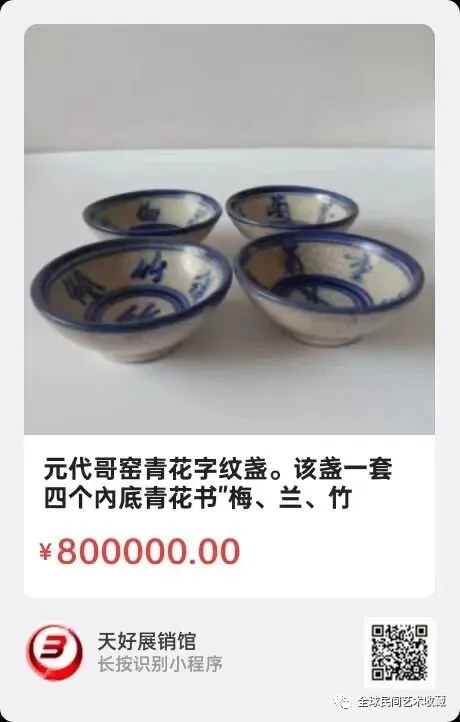 元代哥窑青花字纹盏。该盏一套四个內底青花书"梅、兰、竹、菊",一盏各书一字,内壁各书五个字,盏为厚胎厚釉,口沿青花边圈,青花字青翠浓艳为苏麻泥青釉,盏外无字,青釉开碎片纹为哥窑瓷,外底无釉,每个底心一乳钉,为元代瓷特征。此为元代哥窑青花瓷盏,有其独有价值,传世稀少十分难得珍贵。高3.3公分。口径8.5公分。底径3.9公分。来源:1169.