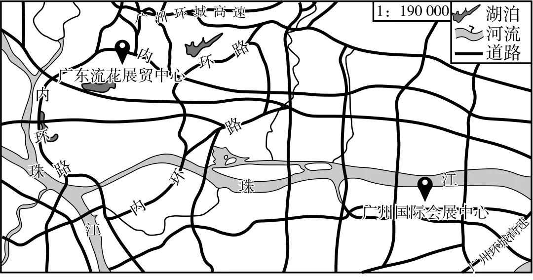 19. 1957年4月,港商华先生来到广州,参加首届中国出口商品交易会(简称“广交会”),到装有风扇的土特产展馆选购粮油产品。下图为广交会会址示意图。读图,回答下列问题。