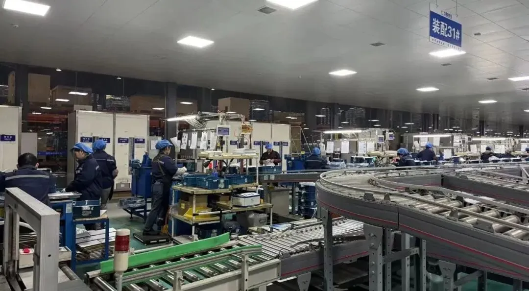 生产车间内,一派热火朝天的忙碌景象映入眼帘——一排排机器正按照程序进行自动化生产作业,机械手臂上下翻飞,十多米高的智能立体仓库中,产品从物料的取出、运输、组装、包装等一系列操作,仅需工作人员定时巡查处理。工人们铆足干劲赶订单,智能化生产线高速运转,一批批产品正源源不断运往全球各地。