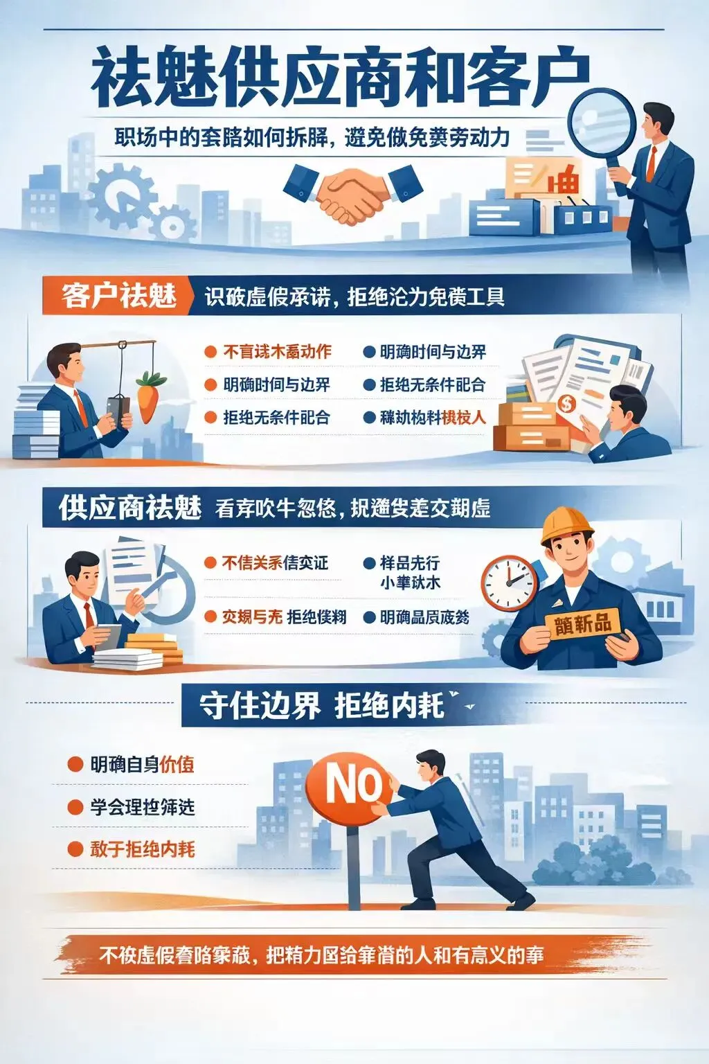 回顾这些经历,明白了有经验的业务的做法:对客户与供应商祛魅,从来不是变得冷漠多疑,而是学会保持理性与清醒,守住自己的专业边界,不被虚假承诺裹挟,坚决拒绝沦为免费劳动力。
