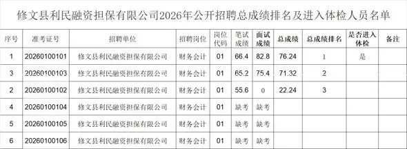 根据《修文县利民融资担保有限公司2026年公开招聘工作人员招聘公告》的规定,2026年修文县利民融资担保有限公司招聘报名、笔试、资格复审、面试工作已结束,现就总成绩排名及体检相关事项公告如下: