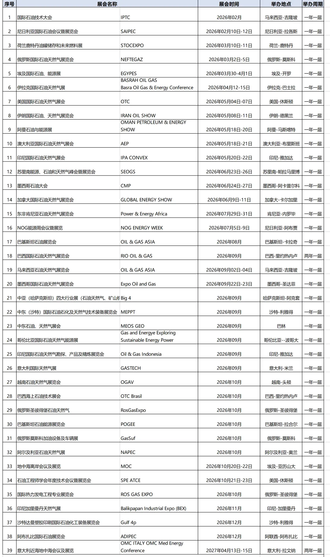 2026年全球热门石油天然气展会计划表