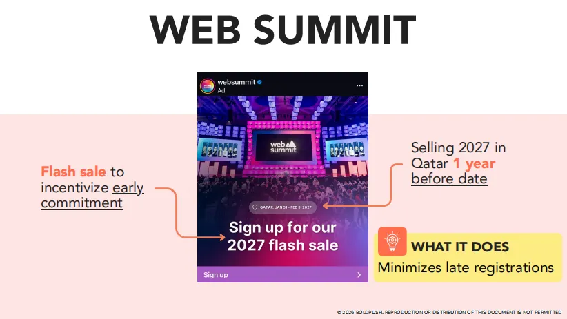 Web Summit在2026年2月就开始推广2027年卡塔尔站的Flash Sale(闪购)。这个策略有两个妙处: