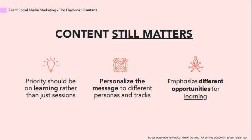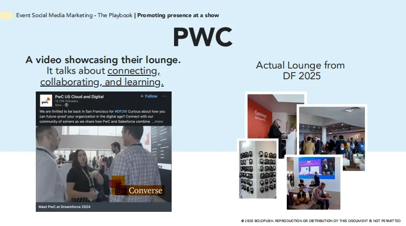 ✅ 每周一条"Countdown"内容 ✅ 推出"Last Chance"优惠 ✅ 发布活动攻略("How to maximize your time at XX") ✅ 动员高管和参展商发布个人内容