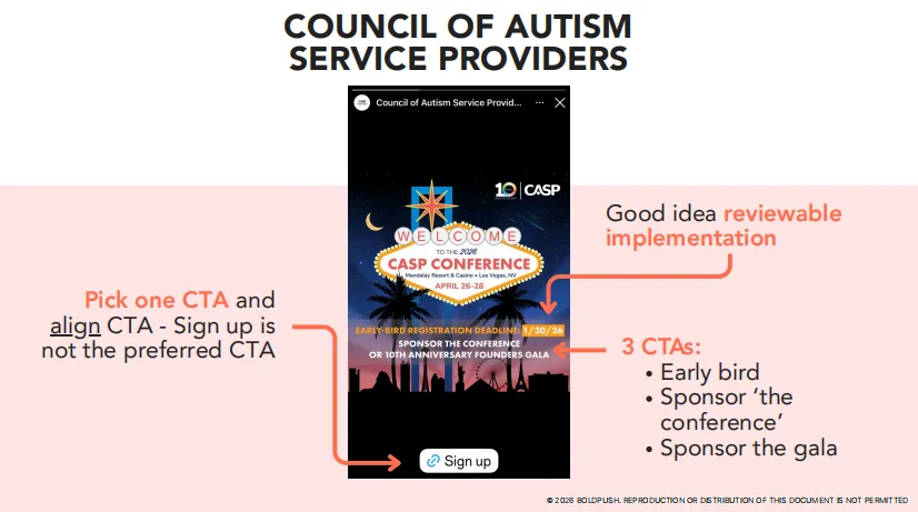 ❌ 三个CTA:"早鸟注册"、"赞助会议"、"赞助晚宴" —— 太乱了 ❌ 视觉元素过多:拉斯维加斯标志+月亮+星星+文字 —— 信息过载 ❌ CTA是"Sign up" —— 对于赞助商来说,"Request Sponsorship Kit"(索取招商手册)更合适