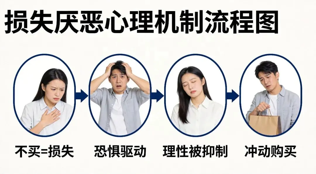 这种营销逻辑利用诺贝尔经济学奖证实的"损失厌恶"心理——人对损失的敏感度是收益的2倍,从而诱导消费者基于恐惧而非需求做出购买决策。