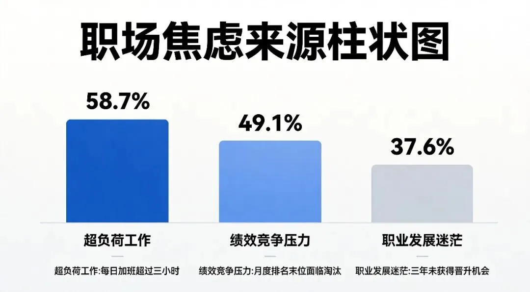 "35岁危机"、"996是福报"等畸形观念将职场人的价值与年龄、加班时长强行挂钩。数据显示,76.8%的企业员工存在中度及以上职场焦虑,主要原因包括: