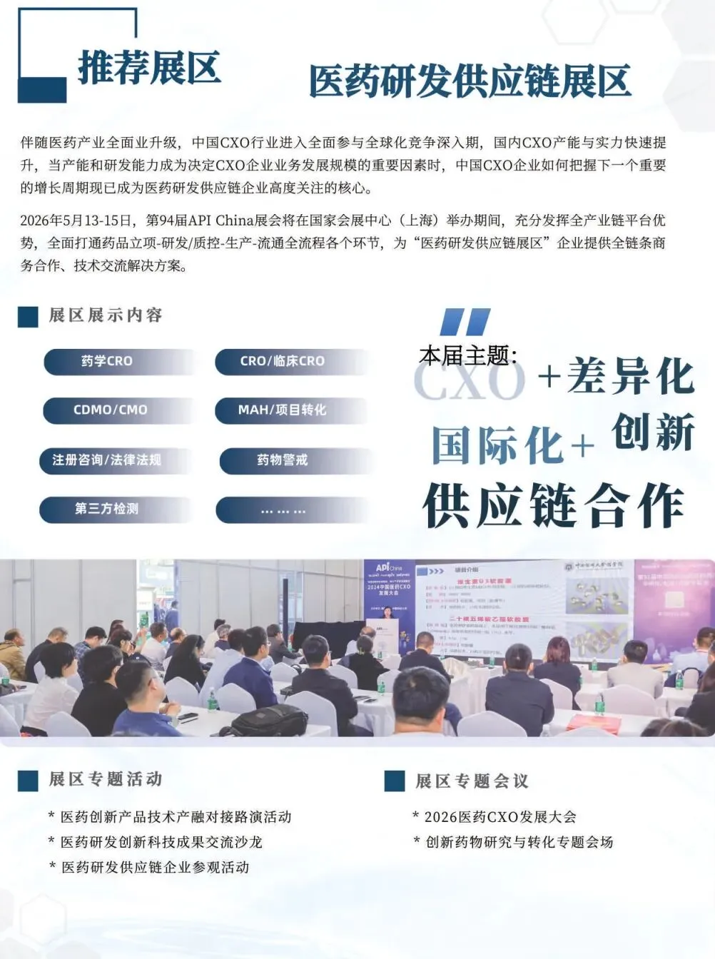 第94届中国国际医药原料药/中间体/包装/设备交易会(API China)将于2026年5月13-15日在国家会展中心(上海)举办。本届展会将与第92届全国药品交易会、2026中国国际健康营养博览会同期同地举办,呈现医药及健康营养行业全产业链、价值链,持续聚焦中国新药研发创新生态构建与原料药/中间体/包装/设备高质量绿色发展路径,着重展出医药原料药、药用辅料、天然产物、医药包装、制药设备等百余种品类、数万种产品,将吸引了数千家化学药、中成药、生物药等制药工业企业现场参观、采购、交流。