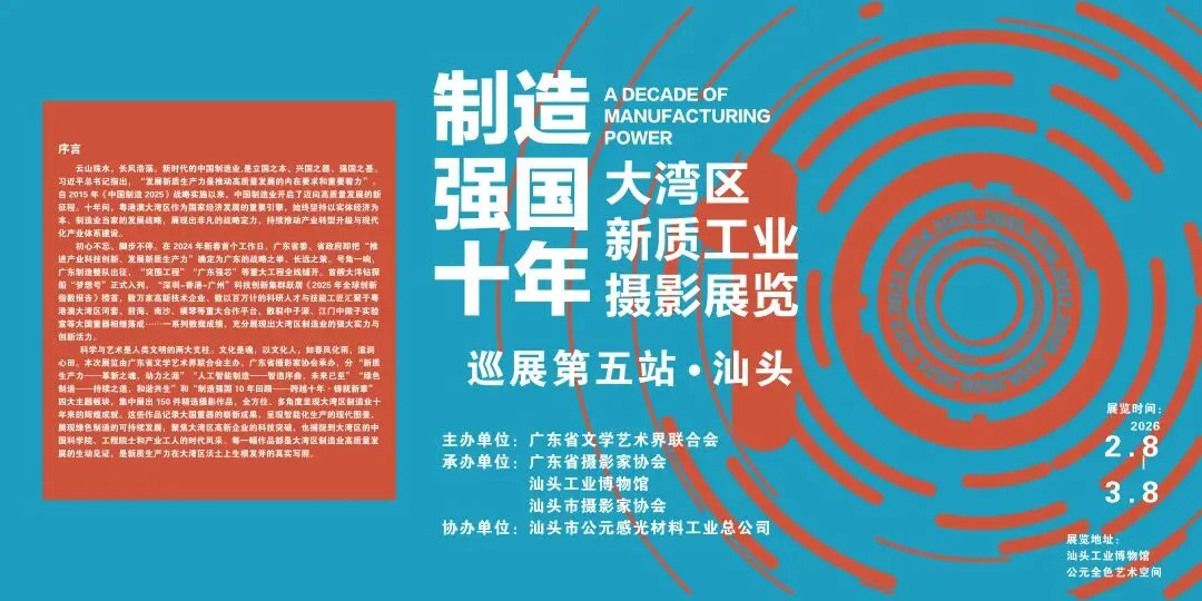 2月8日上午,“制造强国十年——大湾区新质工业摄影展览”巡回展第五站在汕头工业博物馆举行,该展览由省文联主办,省摄影家协会、汕头市摄影家协会承办,汕头资产管理集团有限公司、汕头市公元感光材料工业总公司协办。本次活动旨在通过影像,展示粤港澳大湾区新质生产力的工业摄影。原驻美国大使馆总领事、驻印尼大使馆总领事、外交部公参钟瑞明,市政协领导邱奕辉、陈烈丰参加活动。