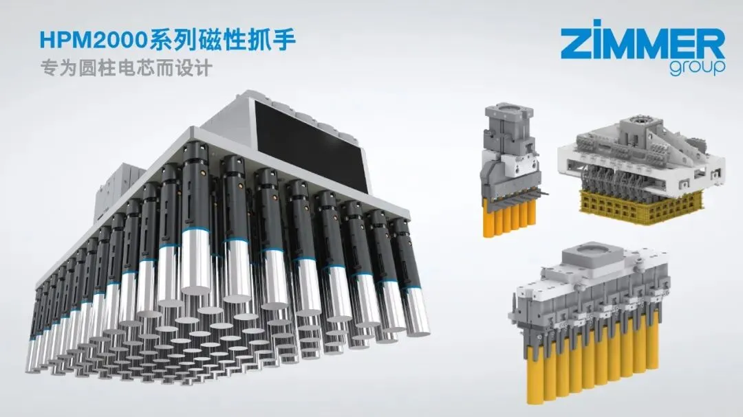 抓取圆形电芯需要保证各个电芯之间的位置精确性。Zimmer Group 以标准磁性机械抓手为基础,开发出一种结构紧凑、性能强大的机械臂末端工具,即使在高加速度和急停情况下也能以 65 N 的保持力牢牢夹住电芯。当磁铁被停用时,机械抓手HPM2046 能以小于 1 N 的残余保持力可靠放置物品。