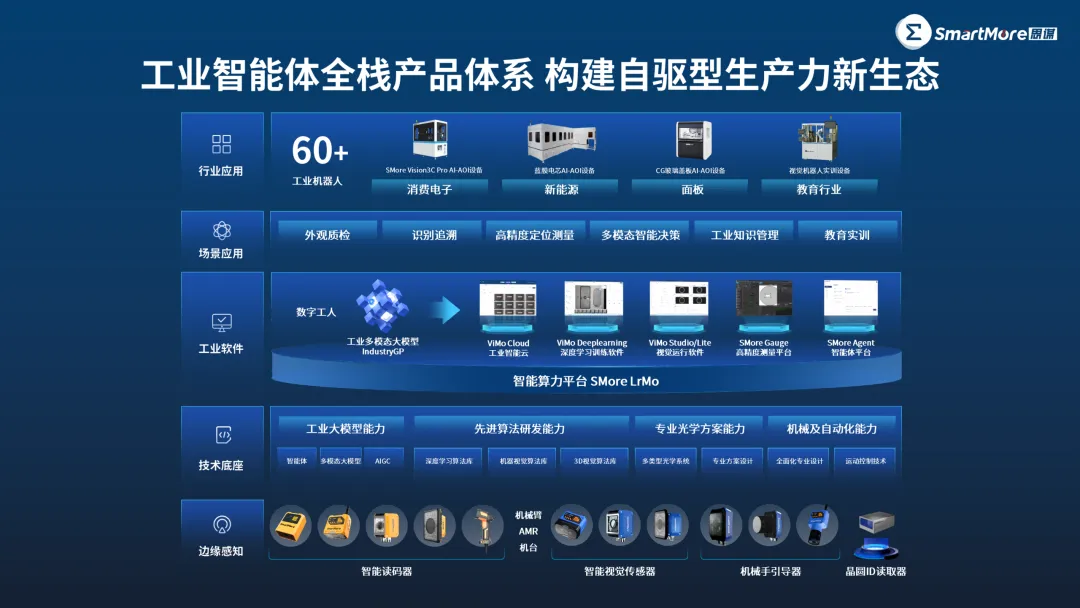 思谋科技,工业智能体全球领军企业,以“大模型+全栈机器人技术”的深度融合,已构建完整的软硬件产品生态。包含自研的工业多模态大模型、智能工业平台、智能传感器以及工业机器人AI-AOI设备,广泛应用于消费电子、新能源等多领域,已服务了特斯拉、中国中车、比亚迪、立讯精密等全球300家行业头部企业。