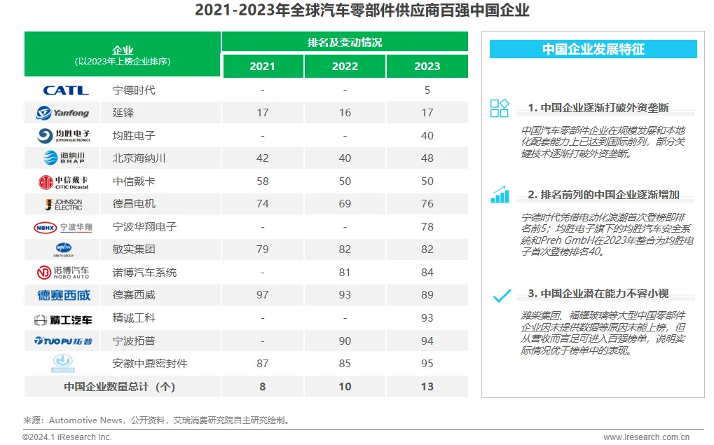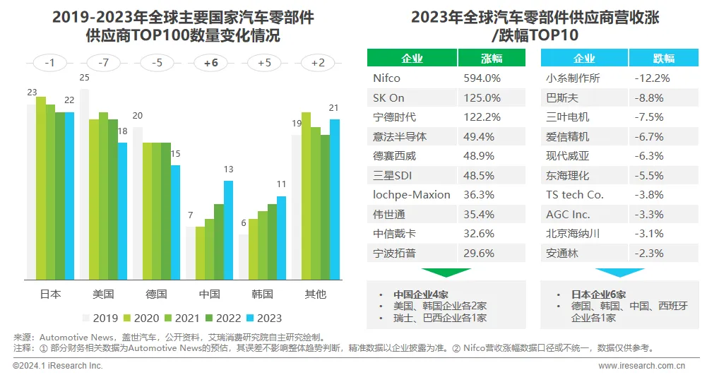 中国汽车行业经过60余年发展,形成了绵密的分工机制并深度融入全球化进程;同时也导致了部分关键环节,一发不可牵,牵之动全身。由于新冠疫情、芯片短缺、地缘政治变迁等多因素的交织,中国汽车供应链的变革突如其来,导致供应链出现多处“卡点”、“堵点”和“断点”,并脱离了多数应急手段的干预范围。与此同时,全球汽车行业正在向智能化、新能源快速发展,消费者需求快速变革,企业之间竞争逐渐白热化,软硬件的集成正在成为兵家必争之地。如今,社会发展已恢复常态。企业的发展不仅仅依赖市场与用户,更加指向了供应链的制约,而供应链韧性成为行业亟需建立的关键能力。由于上述因素,本报告中的供应链数字化,不仅面向数字化技术层面,更多的希望在产业垂直整合、企业发展战略、管理和体系变革层面搭建认知体系,展望VUCA时代下的整零生态。危机时代下,英雄企业的迸发与传统企业的势微并行不悖近5年来,随着汽车行业的电动化、智能化变革,虽然头部企业持续霸榜,但各国头部供应商数量也产生显著变化。美国和德国供应商在全球TOP100中的数量分别由2019年的25家和20家,降至2023年的18家和15家;中国和韩国供应商由2019年的7家和6家,分别增长至2023年的13家和11家,以电池和汽车电子为代表的企业构成了增长的主要来源。同时,在营收涨幅最高的10家企业中,4家来自中国;在营收跌幅最高的10家企业中,6家来自日本,体现出在全球汽车产业分工的背景下,供应链利润结构正在悄然发生转移。中国企业持续提升,与中国引领本次新能源、智能化变革步调保持一致中国汽车零部件出口快速增长,核心零部件的大面积国产替代仍存空间得益于全球汽车产业链的一体化,中国汽车零部件出口金额在震荡中总体呈现增长态势,进出口贸易总体呈现贸易顺差,并逐渐扩大。随着我国汽车零部件质量体系的完善,和新能源方向领先地位的不断加深,中国零部件企业在国际环境下的竞争力逐渐走强,出口方面仍有较大潜力。但在全球市场,我国汽车零部件品牌认知度较弱,汽车附件等出口占比较高,而核心、高端零部件暂时难以做到大面积替代。然而,电动化、智能化趋势在中国的快速发展给中国本土零部件企业带来了新的全球化机遇,并有望迎来新一轮的爆发期。