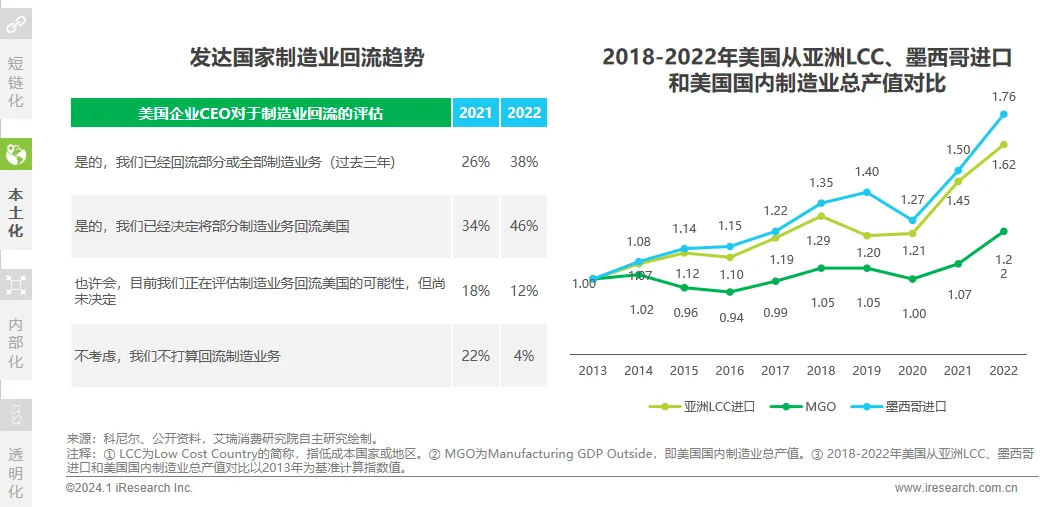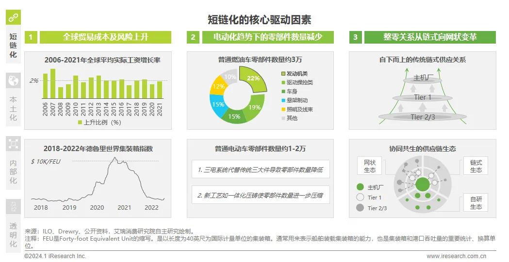 全球汽车供应链呈现逐渐收敛态势,构建更加完善、安全的供应体系全球汽车产业链将缩短重组。第一,全球劳动力成本提升和航运成本的高波动性,迫使企业在全球化的进程中以缩链降本的方式保持成本优势。第二,全球减碳及电动化趋势迅速扩张,而电动汽车较燃油车而言,零部件数量更少,所需供应商数量更少,价值更加集中在芯片、操作系统等知识密集型部件中,并面临着日渐加剧的地缘风险。第三,整零关系从链式向协同共生方向转变,一、二级供应商之间的边界逐渐模糊,主机厂直接参与Tier2 及以下供应商的直接沟通,缩短了信息传导路径。因此,全球汽车供应链呈现逐渐收敛态势,以构建更加完善、安全的供应体系。发达国家制造业回流显著;中国产业集群效应助力打造世界级供应关系在国际层面,传统汽车强国近年来受到了不同程度的产业空心化影响,制造业回流趋势明显。以美国为例,《通胀削减法案》支持电动汽车和清洁能源等的生产和投资,其中多项优惠以在美国本土或北美地区生产和销售作为前提条件,此类政策将成为供应链进一步回迁的催化剂。一项对于美企CEO的调研显示,制造业回流美国本土的趋势展现出强劲的势头。同时,美国从墨西哥的进口增长显著,一方面帮助美企降低物流成本并规避中国劳动力成本的上升,另一方面可以弱化中美关系不确定性带来的影响。在国内层面,我国汽车整零企业在地理位置上的集群效应所带来的优势逐渐显现。宏观而言,在头部链主的带动下实现区域内供应链的自由流动,可实现资源的安全、合理、灵活配置,是实现供应链安全和韧性的重要途径;微观而言,区域级供应可缩短运输距离,提升资金回流速度,减轻供需双方的库存压力。叠加汽车核心关键部件国产化趋势,以点带面的打造多元化供应和灵活可替代的世界级区域供应关系,将有助于提升我国在全球汽车供应体系中的地位和影响力。以核心部件自研的方式改善供应链结构化韧性,重整全球产业话语权目前,芯片、操作系统等核心部件的关键技术仍然受制于海外,错综复杂的国际局势和突发事件导致此类关键部件出现“断点”、“堵点”和“卡点” ,因素包含了自然事件、疫情突发、贸易干扰和人为的资源错配,导致了系统性、阶段性的中长期风险;叠加全球汽车产业朝向新能源与智能化的发展趋势,主机厂亟需在此百年不遇之际掌握核心技术,在全球汽车产业链的变革过程中破除旧生态,建立新制约。当前,多数主机厂在三电、芯片等核心技术上,采用完全自主研发或与科技企业合作研发的模式取得了不俗的进展,并以知识密集型部件内部化的方式改善供应链的结构化韧性。将透明化建设作为除原材料库存之外更为妥当的“备份”方式在供应链面临史无前例的挑战之际,汽车行业开始思考除了原材料库存之外更为妥当的“备份”方式。目前,部分主机厂开始考虑利用透明化建设来应对不确定性带来的断链冲击。由于消费者需求预测难度增大,不断扩大产能和库存便成为了供应链各级成员的自然反应。因此,信息的透明应从消费者需求开始,主机厂有必要向供应商开放消费者的最新动向,以便提供更加优质和适应消费者个性化需求的零部件。虽然透明化能够带来巨大优势,但是必须将其拓展至一级供应商之外,深入至各个层级才是唯一了解风险和瓶颈的方式。根据麦肯锡2022年全球供应链领导者调查,仍有45%的企业没有或仅有一级供应商透明度,这一数据也揭示了供应链韧性不足背后的黑箱。在信息透明的基础上,主机厂可以通过在计划、生产、物流等环节进行供应链的仿真和模拟,实现数字孪生供应链,以便更直接地观察供应商和自身的生产状况,对供应链的风险进行捕捉和预警,最终提高整体供应链决策的科学性和前瞻性。