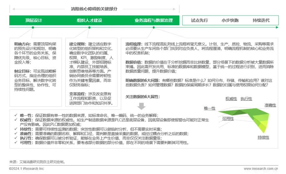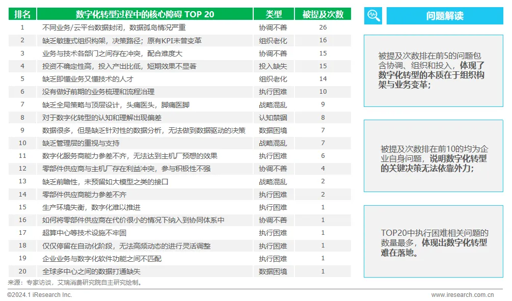 其二,数据治理制度化:数据价值被深入挖掘,数据安全风险持续上升,车企对数据的重视程度也在不断提升,并积极推动数据治理制度化,以期更好发挥数据价值。企业内部建立业务驱动的数据治理架构、数据管理组织和管理体系,设立内部的数据治理部,制订统一数据标准,形成数据流通相关流程及数据安全事故处理制度等。然而,汽车企业从传统化向数字化转型过程并非一帆风顺,反而会受困于传统的IT管理模式,面临难点,导致多重挑战,归类为五大方面。3.1 整体数字化进程落后