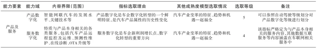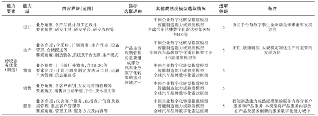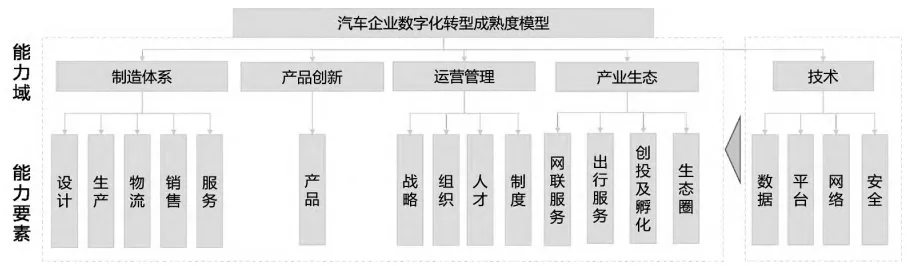 如图1所示,该评估模型能力域分别为制造体系、产品创新、运营管理、产业生态和技术,综合反映了汽车企业通过数字化转型技术与方法对传统业务、商业模式、产品及服务创新的有效赋能。