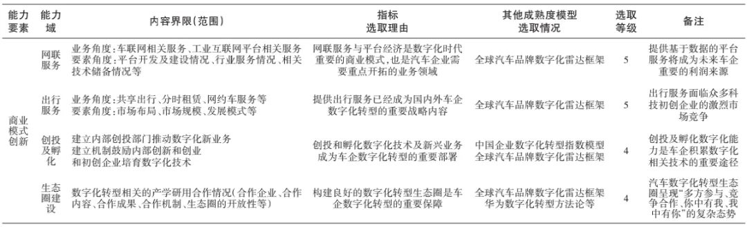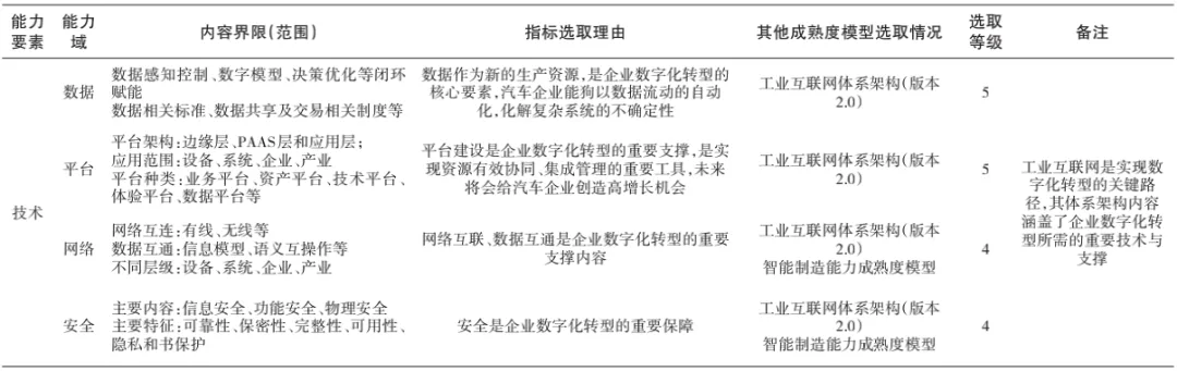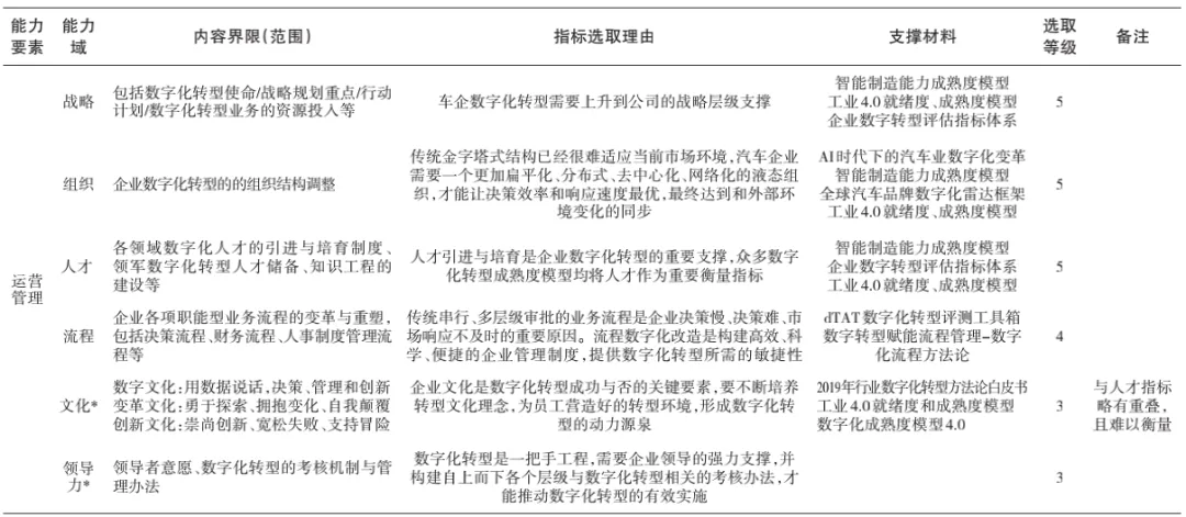 18个能力要素指标选取是在深入分析不同成熟度评估模型基础上,结合汽车企业数字化转型关注重点,通过德尔菲法研究确定,最终选取结果为选取等级为4以上的相关指标如表1-5所示。