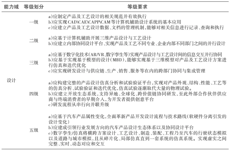 为全面评估汽车企业数字化转型路径与效果,本模型研究制定了不同成熟度等级下,企业不同指标领域需要满足的条款要求。以设计为例,本模型研究制定了不同成熟度等级下企业需要满足的条款内容,对企业数字化转型的基本路径和内容进行了有效界定如下页表6所示。