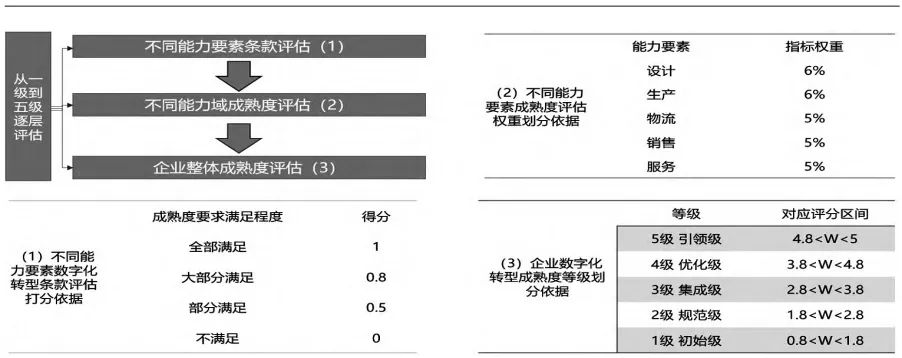 首先,将企业不同能力要素数字化转型条款满足程度划分为四个层次:分别是不满足,部分满足、大部分满足和全部满足,对应得分情况分别为0,0.5,0.8和1;其次,根据不同指标权重情况计算企业不同成熟度等级得分情况;最后依据成熟度等级划分依据,确定企业最终成熟度所处的等级情况如下页图2所示。