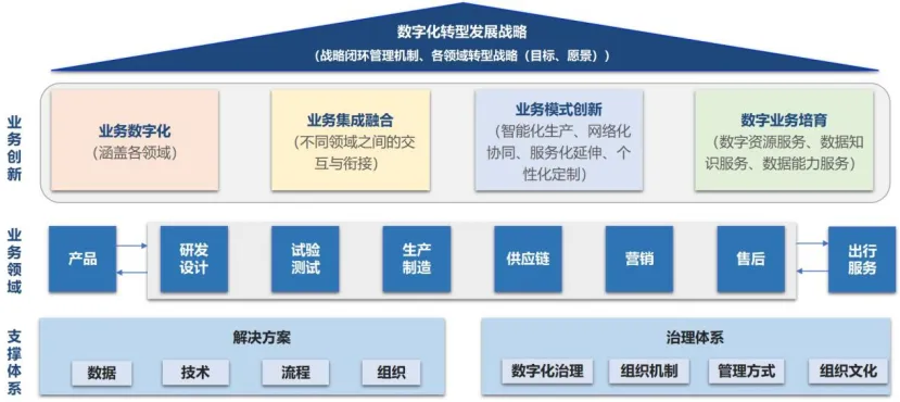 尽管很多汽车企业已经深刻认知到数字化转型的必要性,并且将数字化转型作为企业的核心战略进行推动,但是在实际推进过程中遇到众多困难,包括企业对数字化转型整体认知不统一、转型顶层规划缺失或不合理、诊断与评估方案缺失等,严重制约了汽车企业数字化转型的发展进程,如何全面评估和诊断汽车企业数字化转型发展现状,为企业转型顶层规划与实施落地提供支撑,成为汽车企业存在的迫切需求。