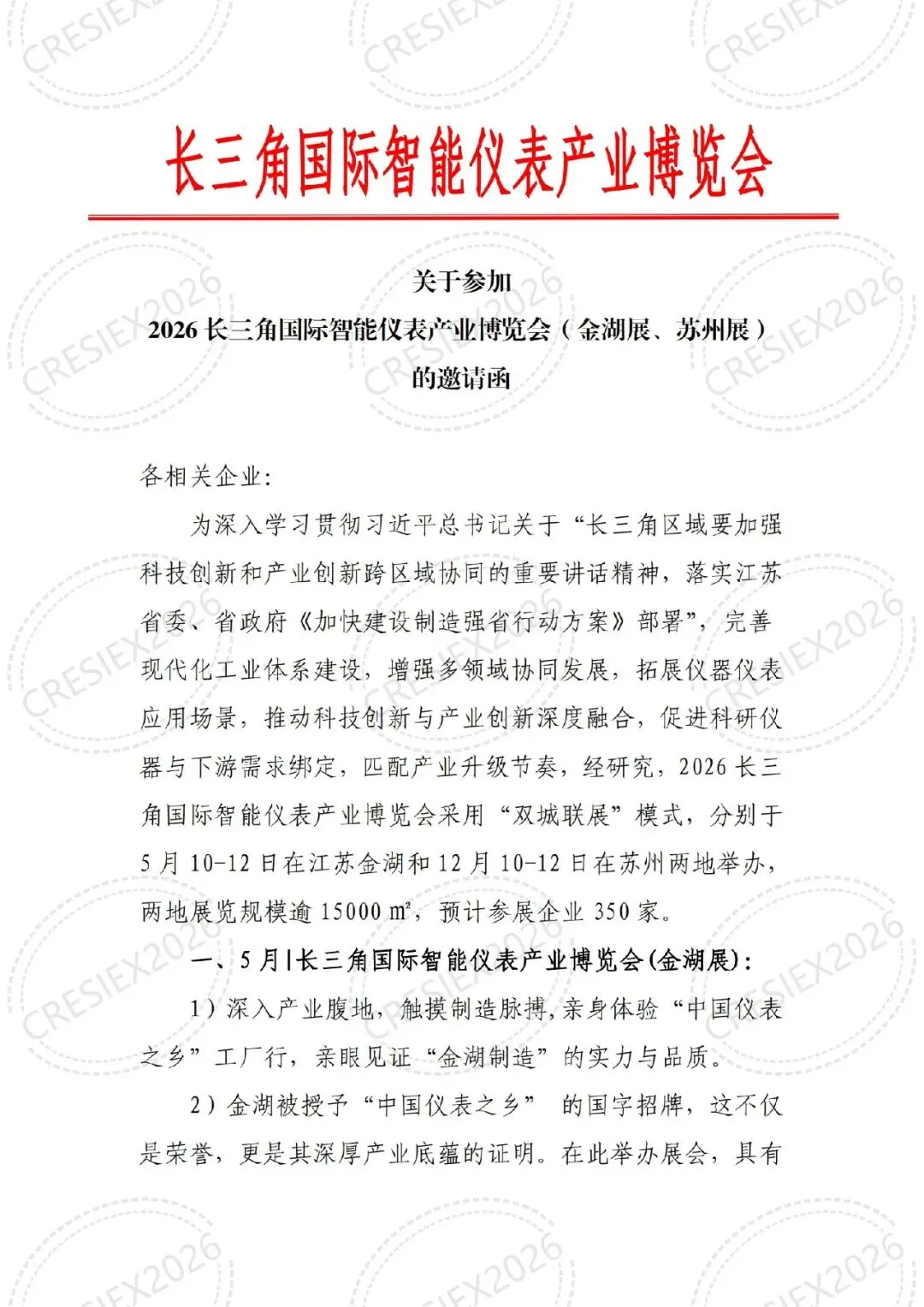 关于邀请参加“2026长三角国际智能仪表产业博览会(江苏金湖展、苏州展)的函”